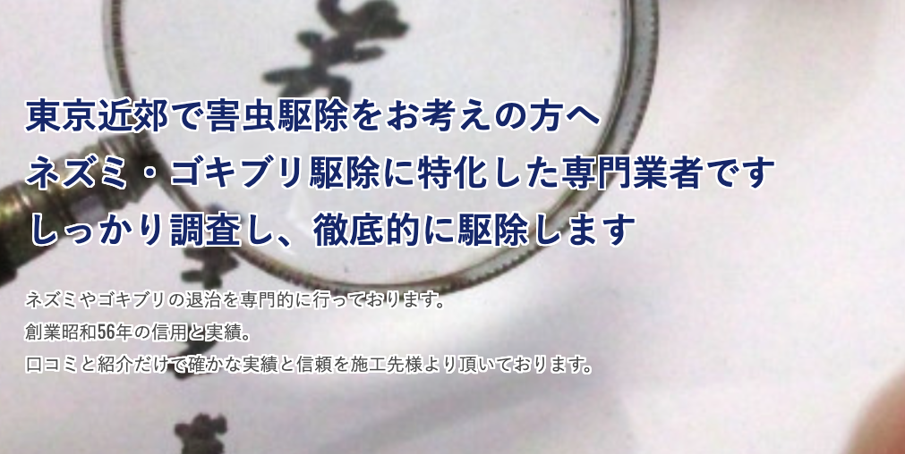 東京に拠点を置く害虫駆除業者「有限会社ミヤザキ」は、主に関東圏に対応しており、経験の豊かなスタッフが防鼠工事やゴキブリ対策工事を施してまいります。